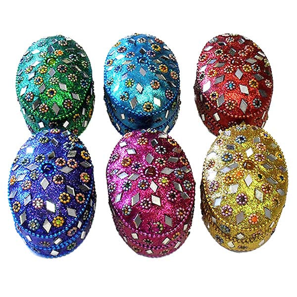 Unashamedly bling, these gorgeous handmade trinket pots come in a variety of colours and feature diamond-shaped mirror pieces. Fit for a queen! Available in an oval or circular shape and in three different sizes.