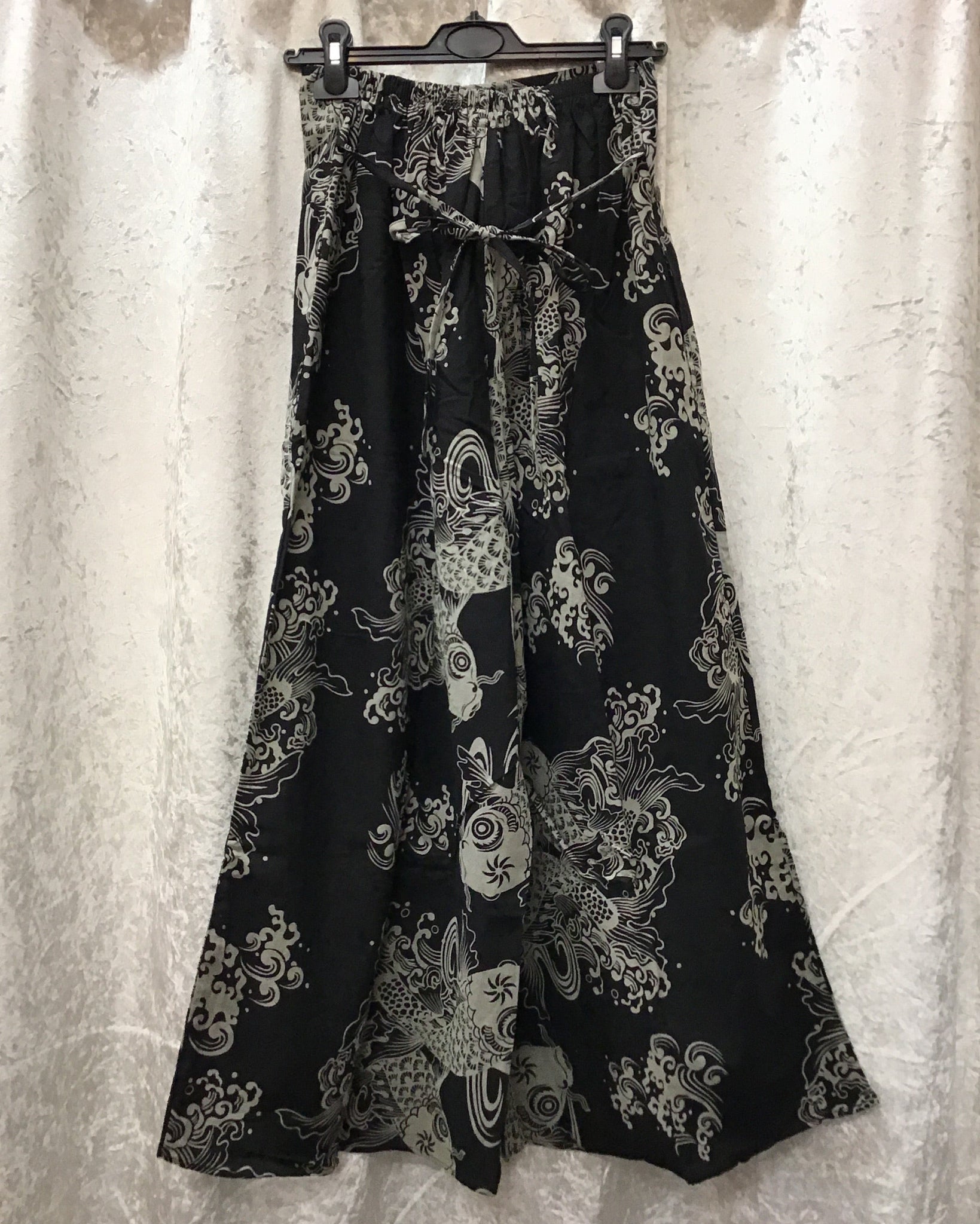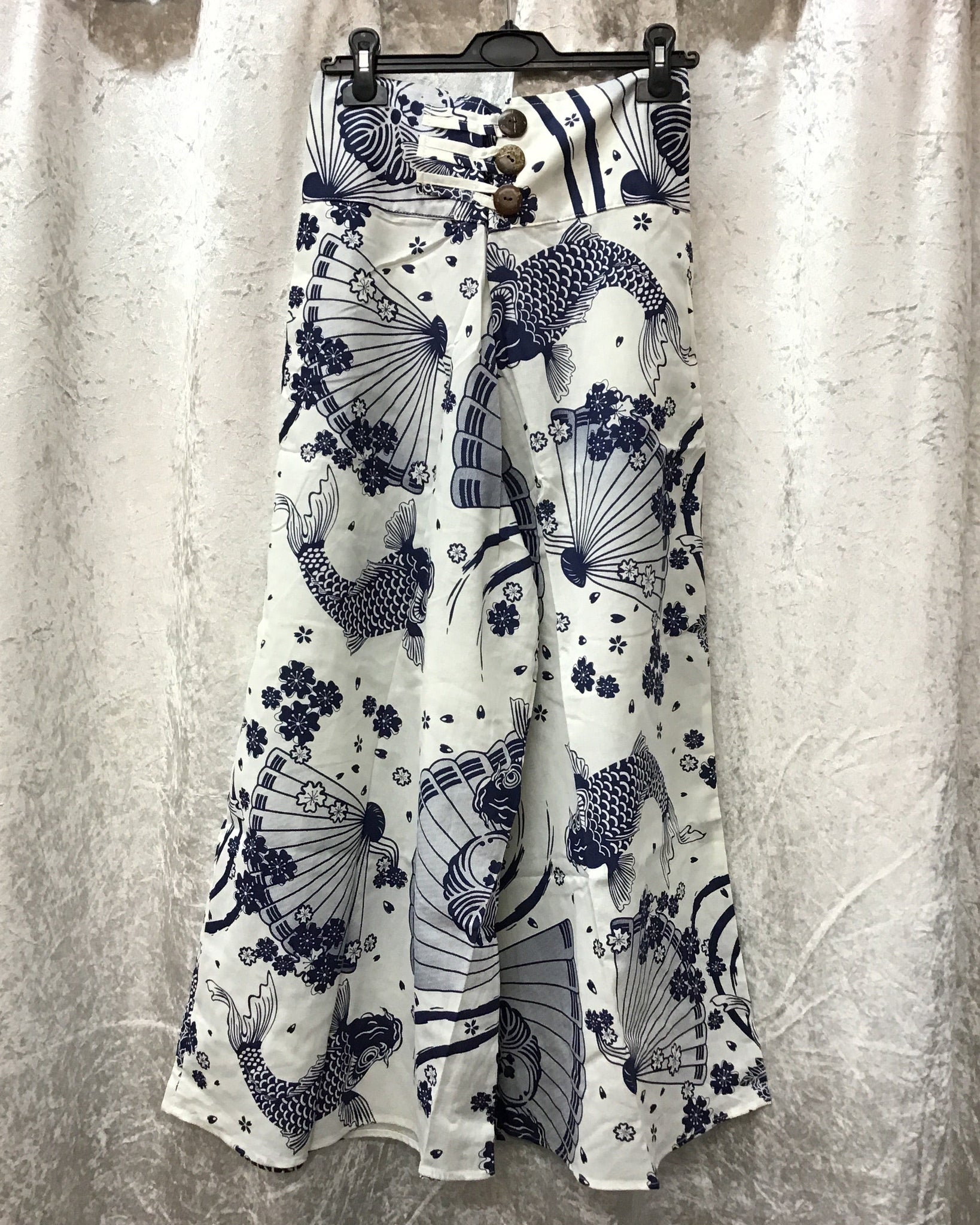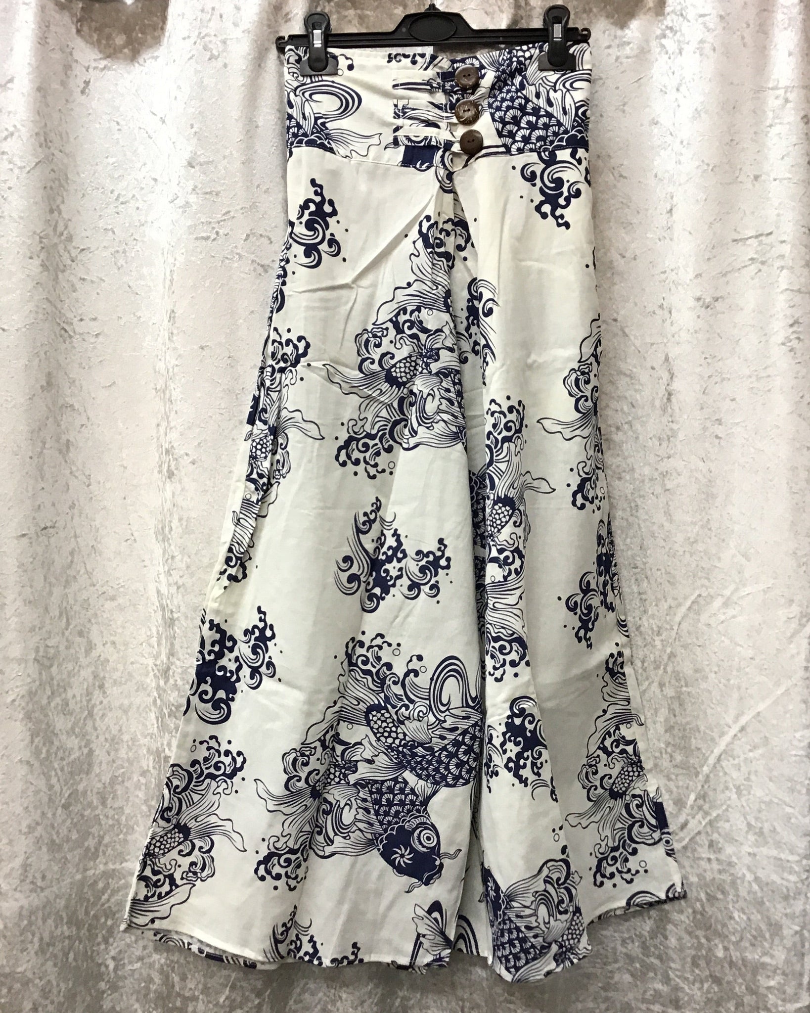 Introducing the KOI Palazzo Pants, adorned with a beautiful koi fish print. Featuring 3 coco buckles to expand the elasticated waist with a tie-up back for a perfect fit, these wide leg pants are sure to be a comfy addition to anyone’s wardrobe. Made with high-quality cotton, these pants are both stylish and functional.